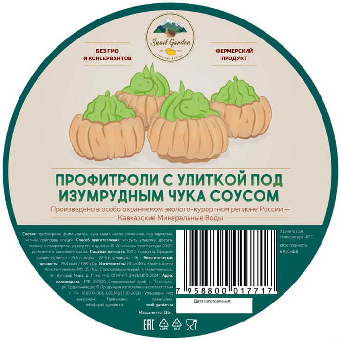 Профитроли с улиткой под Чука-соусом – это нечто незабываемое. Представьте, филе средиземноморских улиток без панциря под изумрудным соусом из водорослей – невыразимые словами вкусовые ощущения. Кстати, японцы уверены, салат или соус Чука – самое полезное блюдо. Поэтому шеф-повара страны Восходящего Солнца добавляют этот ингредиент практически в каждое блюдо. Полезность компонента французской кухни – улиток, также не подвергается сомнениям. Это низкокалорийный продукт с высоким содержанием белков. Приготовление: вскрыть упаковку, вытащить тарелку, разогреть в духовке в течение 15-20 минут при температуре 200 градусов до момента закипания масла. После этого наслаждайтесь многообразием вкуса и поправляйте свое здоровье.