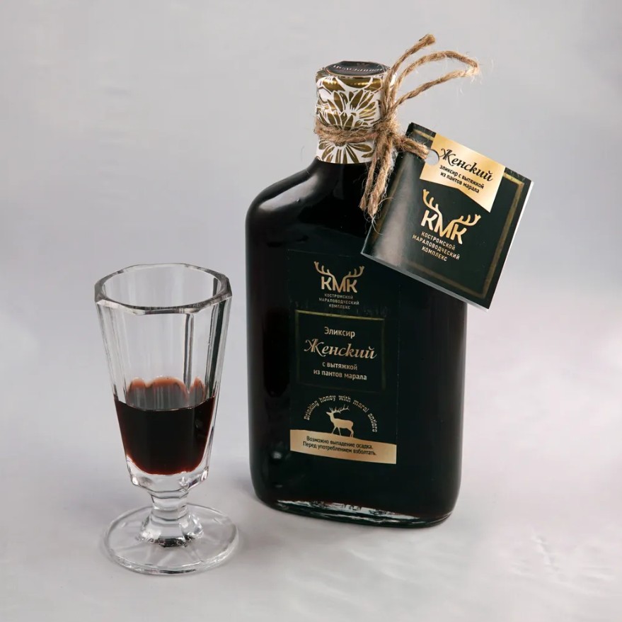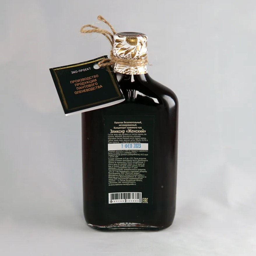 Эликсир женский с пантами. Напиток безалкогольный с вытяжкой из пантов марала, женских трав. Имеют в своём составе только натуральные, экологически чистые экстракты и соки полезных трав и растений, мёд и родниковую воду, не содержит искусственных красителей и усилителей вкуса. Показания: Применяется для улучшения общего самочувствия, вспомогательного лечения, профилактики при мужских и женских заболеваниях воспалительного характера, восстановление после перенесённых заболеваний и операций.